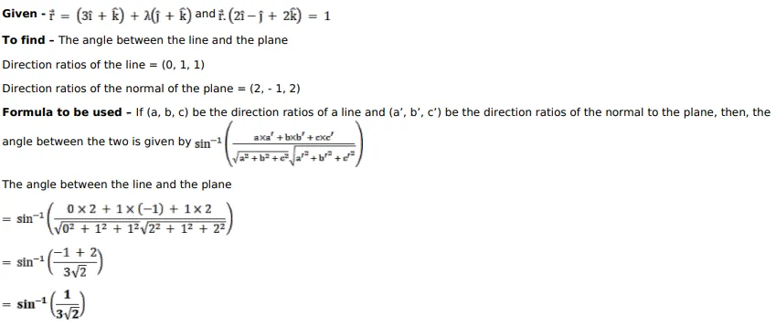 Find the angle between the line $\overrightarrow{\mathrm{r}}=(3 \hat{\mathrm{i}}+\hat{\mathrm{k}})+\lambda(\hat{\mathrm{j}}+\hat{\mathrm{k}})$ and the plane $\overrightarrow{\mathrm{r}} \cdot(2 \hat{\mathrm{i}}-\hat{\mathrm{j}}+2 \hat{\mathrm{k}})=1$.