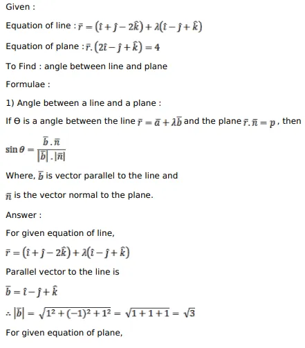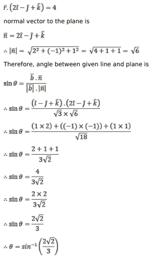 Find the angle between the line $\bar{r}-(\hat{i}+\hat{j}-2 \hat{k})+\lambda(\hat{i}-\hat{j}+\hat{k})$ and the plane $\bar{r} \cdot(2 \hat{i}-\hat{j}+\hat{k})=4$.