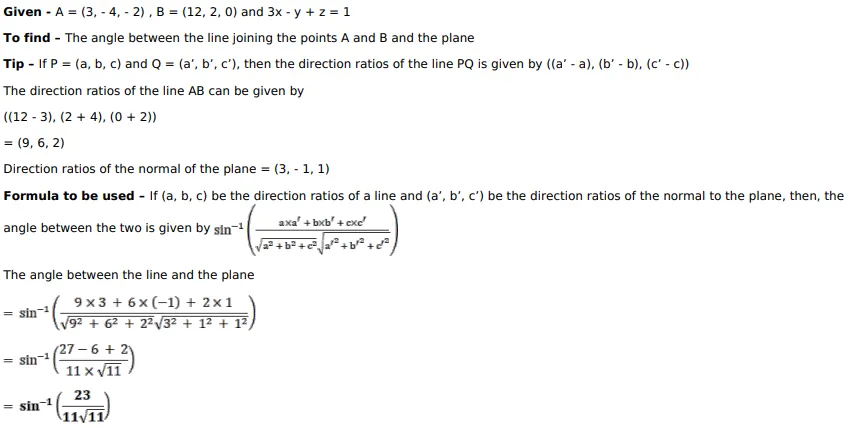 Find the angle between the line joining the points $A(3,-4,-2)$ and $B(12,2,0)$ and the plane $3 x-y+z=1$.