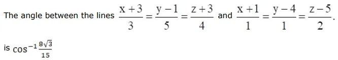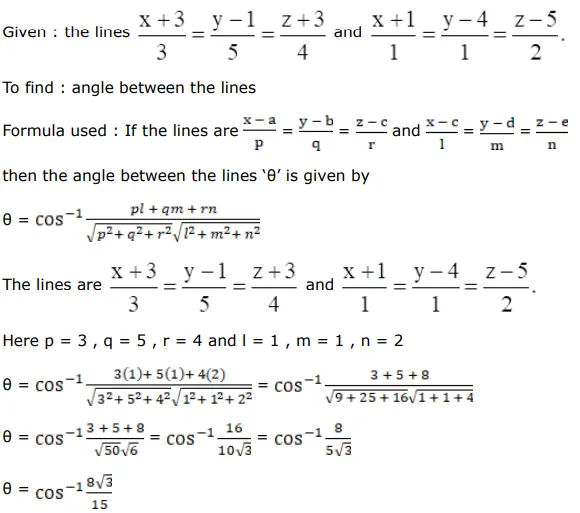 Find the angle between the lines $\frac{x+3}{3}=\frac{y-1}{5}=\frac{z+3}{4}$ and $\frac{x+1}{1}=\frac{y-4}{1}=\frac{z-5}{2}$.