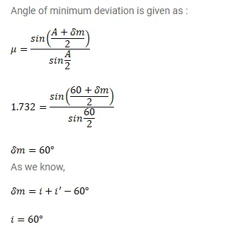 Find the angle of minimum deviation for an equilateral prism made of a material of refractive index $1.732$ What is the angle of incidence for this deviation?