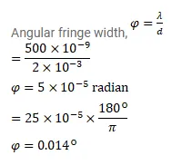 Find the angular separation between the consecutive bright fringes in a Young's double slit experiment with blue-green light of wavelength $500 \mathrm{~nm}$. The separation between the slits is $2.0 \times 10^{-3} \mathrm{~m}$.
