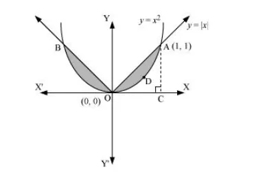 The area bounded by the curves, $\left\{(x, y): y \geq x^{2}\right.$ and $\left.y=|x|\right\}$, is represented by the shaded region as