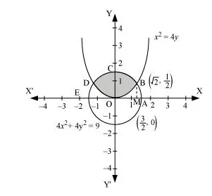 Solving the given equation of circle, $4 x^{2}+4 y^{2}=9$, and parabola, $x^{2}=4 y$, we obtain the point of intersection as $\mathrm{B}\left(\sqrt{2}, \frac{1}{2}\right)$ and $\mathrm{D}\left(-\sqrt{2}, \frac{1}{2}\right)$.