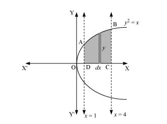 The area of the region bounded by the curve, $y^{2}=x$, the lines, $x=1$ and $x=4$, and the $x$-axis is the area $A B C D$.