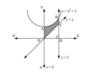 The area bounded by the curves, $y=x^{2}+2, y=x, x=0$, and $x=3$, is represented by the shaded area OCBAO as
