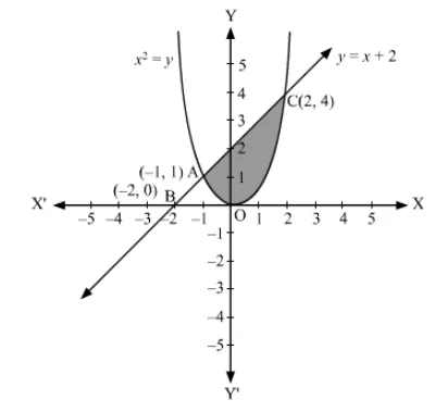 The point of intersection of the parabola, x2 = y, and the line, y = x + 2, is A (–1, 1) and C(2, 4).