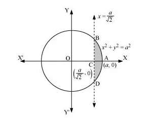 The area of the smaller part of the circle, $x^{2}+y^{2}=a^{2}$, cut off by the line, $x=\frac{a}{\sqrt{2}}$, is the area ABCDA.