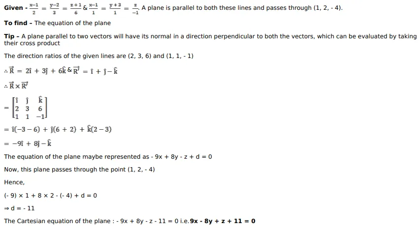 Find the Cartesian and vector equations of a plane passing through the point $(1,2,-4)$ and parallel to the lines $\frac{x-1}{2}=\frac{y-2}{3}=\frac{z+1}{6}$ and $\frac{x-1}{1}=\frac{y+3}{1}=\frac{z}{-1}$