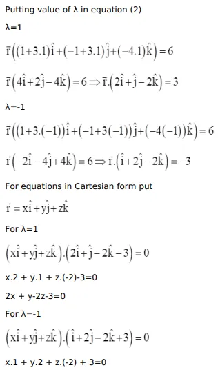 Find the Cartesian and vector equations of the planes through the line of intersection of the planes $\overrightarrow{\mathrm{r}} \cdot(\hat{\mathrm{i}}-\hat{\mathrm{j}})+6=0$ and $\overrightarrow{\mathrm{r}} \cdot(3 \hat{\mathrm{i}}+3 \hat{\mathrm{j}}-4 \hat{\mathrm{k}})=0$, which are at a unit distance from the origin.