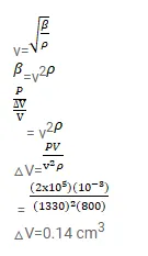 Find the change in the volume of $1.0$ litre kerosene when it is subjected to an extra pressure of $2.0 \times 10^{5} \mathrm{~N} \mathrm{~m}^{-2}$ from the following data. Density of kerosene $=800 \mathrm{~kg} \mathrm{~m}^{-3}$ and speed of sound in kerosene $=1330 \mathrm{~ms}^{-1}$.