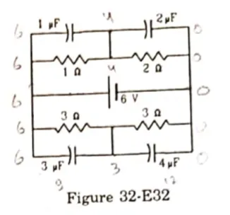 Find the chargers on the four capacitors of capacitances $1 \mu \mathrm{F}, 2 \mu \mathrm{F}, 3 \mu \mathrm{F}$ and $4 \mu \mathrm{F}$ shown in figure (32-E32).