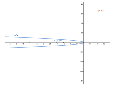 Focus: $F(-a, 0)=F\left(-\frac{3}{2}, 0\right)$
