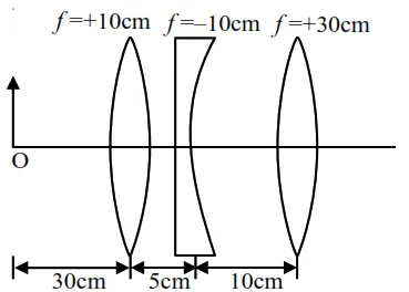 Find the distance of the image from object $\mathrm{O}$, formed by the combination of lenses in the figure :