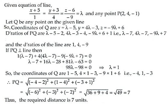 Find the distance of a point (2, 4, –1) from the line $\frac{x+5}{1}=\frac{y+3}{4}=\frac{z-6}{-9}$