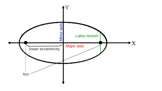 Eccentricity, $\mathrm{e}=\frac{\mathrm{c}}{\mathrm{a}}$ …(iii)