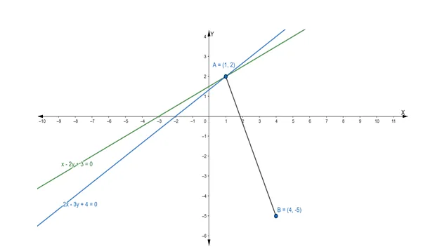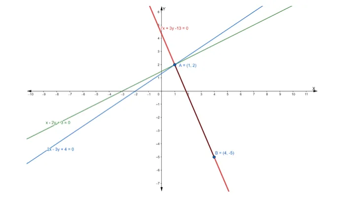 Let $A B$ is the line drawn from the point of intersection $(1,2)$ and passing through the point $(4,-5)$