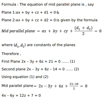 Find the equation of the plane mid-parallel to the planes $2 x-3 y+6 z+21=0$ and $2 x-3 y+6 z-14=0$