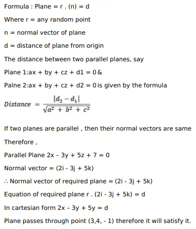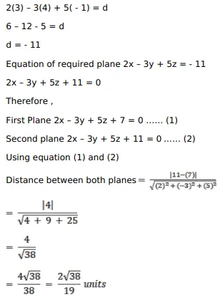 Find the equation of the plane parallel to the plane $2 x-3 y+5 z+7=0$ and passing through the point ( 3 , 4 , $-1$ ). Also, find the distance between the two planes.