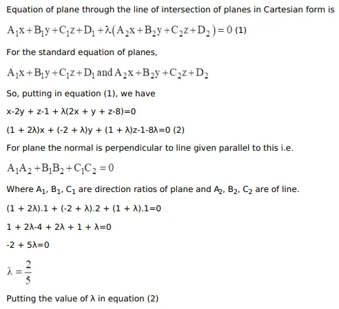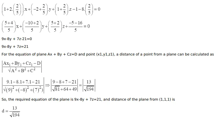 Find the equation of the plane passing through the intersection of the planes $x-2 y+z=1$ and $2 x+y+z=8$, and parallel to the line with direction ratios $1,2,1$. Also, find the perpendicular distance of $(1,1,1)$ from the plane.