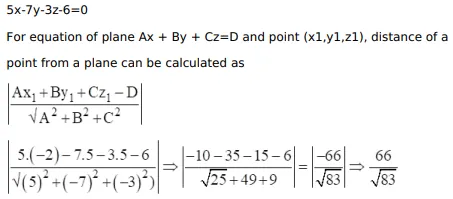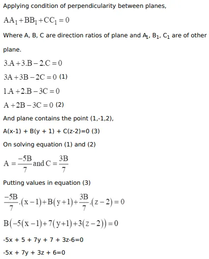 Find the equation of the plane that contains the point $A(1,-1,2)$ and is perpendicular to both the planes $3 x+3 y-2 z=5$ and $x+2 y-3 z=$ 8. Hence, find the distance of the point $P(-2,5,5)$ from the plane obtained above.