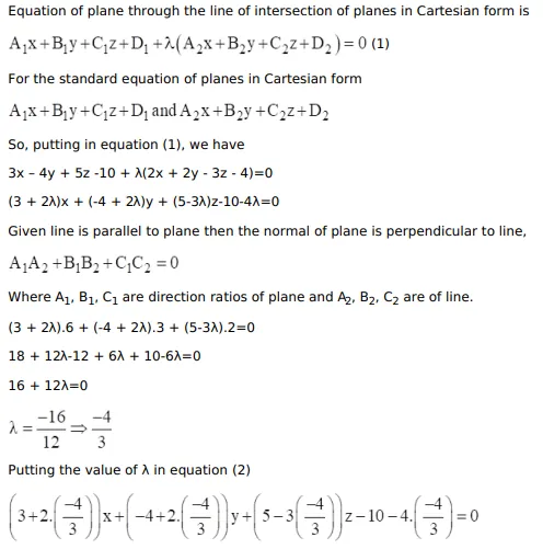 Find the equation of the plane through the intersection of the planes $3 x-4 y+5 z=10$ and $2 x+2 y-3 z=4$ and parallel to the line $x=2 y=$ $3 z$.