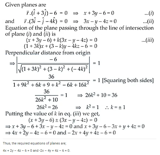 Find the equation of the plane through the intersection of the planes $\vec{r} \cdot(\hat{i}+3 \hat{j})-6=0$ and $\vec{r} \cdot(3 \hat{i}-\hat{j}-4 \hat{k})=0$, whose perpendicular distance from origin is unity.