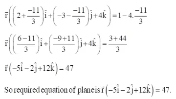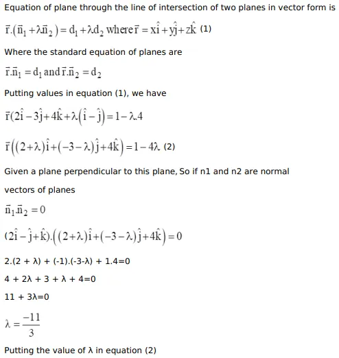 Find the equation of the plane through the line of intersection of the planes $\overrightarrow{\mathrm{r}} \cdot(2 \hat{\mathrm{i}}-3 \hat{\mathrm{j}}+4 \hat{\mathrm{k}})=1$ and $\overrightarrow{\mathrm{r}} \cdot(\hat{\mathrm{i}}-\hat{\mathrm{j}})+4=0$ and perpendicular to the plane $\overrightarrow{\mathrm{r}} \cdot(2 \hat{\mathrm{i}}-\hat{\mathrm{j}}+\hat{\mathrm{k}})+8=0$