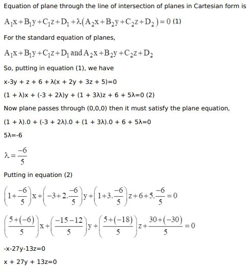 Find the equation of the plane through the line of intersection of the planes $x-3 y+z+6=0$ and $x+2 y+3 z+5=0$, and passing through the origin.
