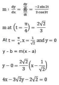 Find the equation of the tangent at $t=\frac{\pi}{4}$ for the curve $x=\sin 3 t, y=\cos 2 t$
