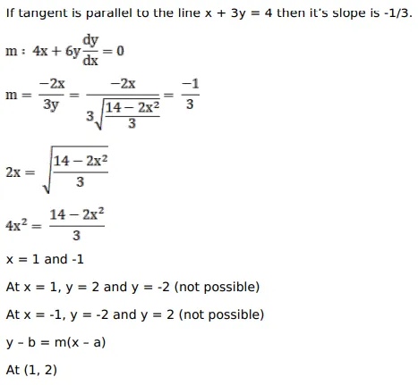 Find the equation of the tangents to the curve $2 x^{2}+3 y^{2}=14$, parallel to the line $x=3 y=4$.