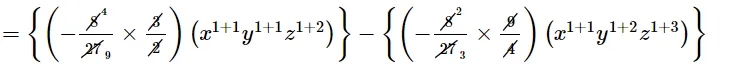 $=\left\{\left(-\frac{8}{27} \times \frac{3}{2}\right)\left(x^{1+1} y^{1+1} z^{1+2}\right)\right\}-\left\{\left(-\frac{8}{27} \times \frac{9}{4}\right)\left(x^{1+1} y^{1+2} z^{1+3}\right)\right\}$
