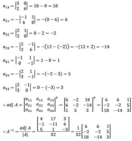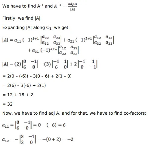 We have, $A=\left[\begin{array}{ccc}2 & -1 & 1 \\ 3 & 0 & -1 \\ 2 & 6 & 0\end{array}\right]$