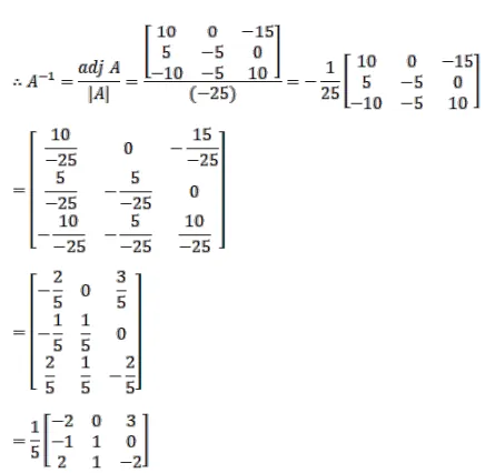 Ans. $\frac{1}{5} \cdot\left[\begin{array}{ccc}-2 & 0 & 3 \\ -1 & 1 & 0 \\ 2 & 1 & -2\end{array}\right]$