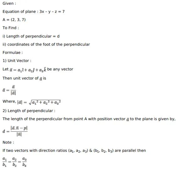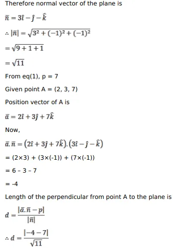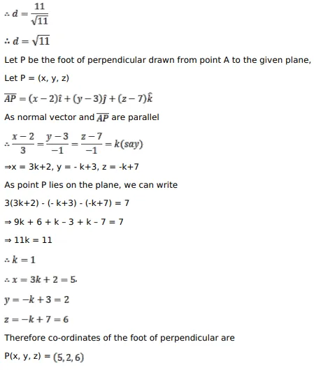 Find the length and the foot of perpendicular drawn from the point $(2,3,7)$ to the plane $3 x-y-z=7$.
