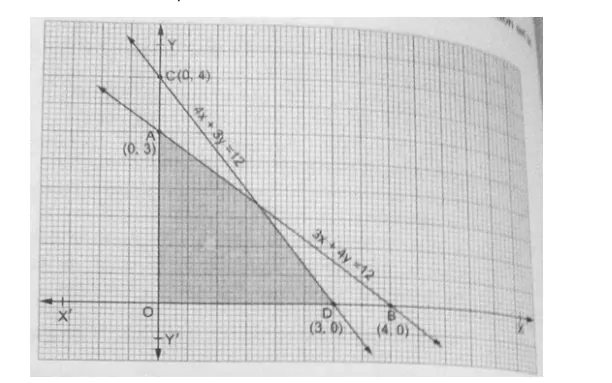Thus the linear inequation comprising the given solution set are $+4 y \leq 12,4 x+3 y \leq 12, x \geq 0, y \geq 0$