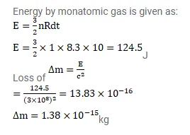Find the loss in the mass of 1 mole of an ideal monatomic gas kept in a rigid container as it cools down by $10^{\circ} \mathrm{C}$. The gas constant $\mathrm{R}=8.3 \mathrm{~J} / \mathrm{mol}-\mathrm{K}$.