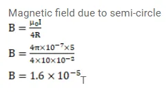 Find the magnetic field B due to a semicircular wire of radius $10.0 \mathrm{~cm}$ carrying a current of $5.0 \mathrm{~A}$ as its center of curvature.