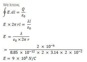 Find the magnitude of the electric field at a point $4 \mathrm{~cm}$ away from a line charge of density $2 \times 10^{-6} \mathrm{C} / \mathrm{m}$.