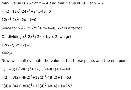 Find the maximum and minimum values of $3 x^{4}-8 x^{3}+12 x^{2}-48 x+1$ on the interval $[1,4]$