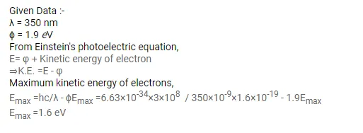 Find the maximum kinetic energy of the photoelectrons ejected when light of wavelength $350 \mathrm{~nm}$ is incident on a cesium surface. Work function of cesium $=1.9 \mathrm{eV}$