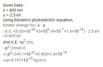 Find the maximum magnitude of the linear momentum of a photoelectron emitted when a wavelength of $400 \mathrm{~nm}$ falls on a metal with work function $2.5 \mathrm{eV}$.