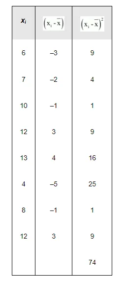 Variance $\left(\sigma^{2}\right)=\frac{1}{\mathrm{n}} \sum_{i=1}^{8}\left(\mathrm{x}_{i}-\overline{\mathrm{x}}\right)^{2}=\frac{1}{8} \times 74=9.25$