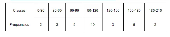 Mean, $\bar{x}=\mathrm{A}+\frac{\sum_{\mathrm{i}=1}^{7} \mathrm{f}_{\mathrm{i}} \mathrm{y}_{\mathrm{i}}}{\mathrm{N}} \times \mathrm{h}=105+\frac{2}{30} \times 30=105+2=107$
