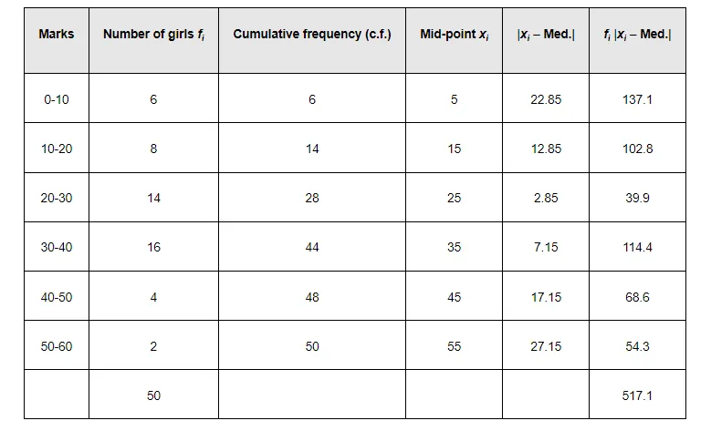 M.D. $(\mathrm{M})=\frac{1}{\mathrm{~N}} \sum_{i=1}^{0} f_{i}\left|x_{i}-\mathrm{M}\right|=\frac{1}{50} \times 517.1=10.34$