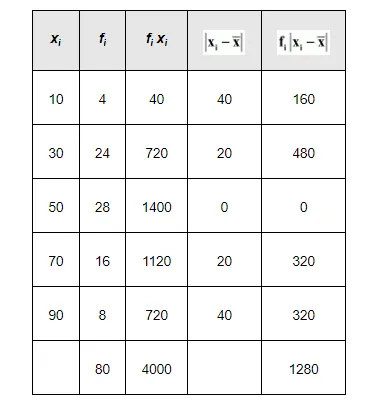 $\operatorname{MD}(\bar{x}) \frac{1}{N} \sum_{i=1}^{5} f_{i}\left|x_{i}-\bar{x}\right|=\frac{1}{80} \times 1280=16$