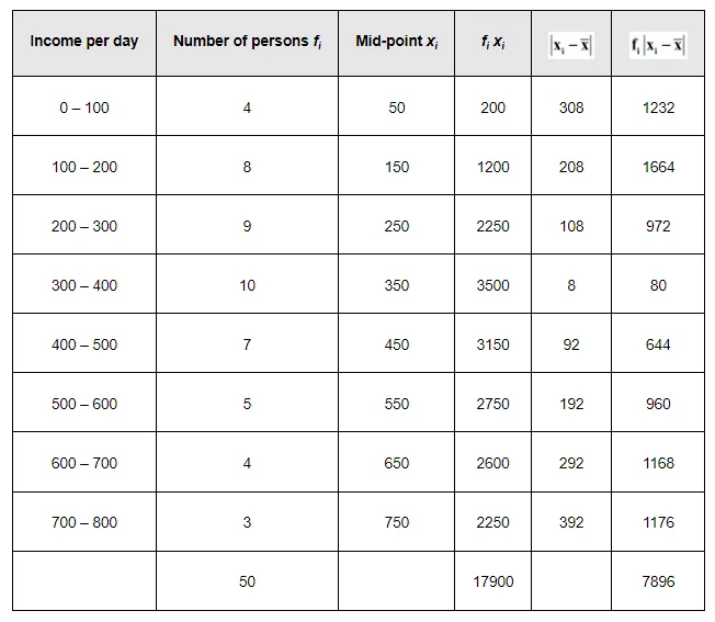 M.D. $(\bar{x})=\frac{1}{N} \sum_{i=1}^{8} \mathrm{f}_{i}\left|\mathrm{x}_{i}-\bar{x}\right|=\frac{1}{50} \times 7896=157.92$