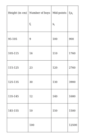 Therefore, $\overline{\mathrm{x}}=\frac{\sum_{\mathrm{i}=1}^{6} \mathrm{f}_{\mathrm{i}} \mathrm{x}_{\mathrm{i}}}{\sum_{\mathrm{i}=1}^{6} \mathrm{f}_{\mathrm{i}}}=\frac{12500}{100}=125$