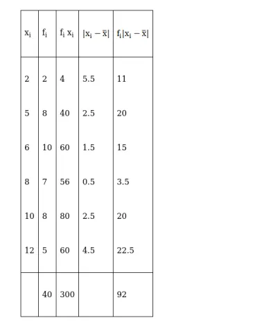 $\overline{\mathrm{x}}=\frac{\sum_{\mathrm{i}=1}^{6} \mathrm{f}_{\mathrm{i}}\left|\mathrm{x}_{\mathrm{i}}-\overline{\mathrm{x}}\right|}{\sum_{\mathrm{i}=1}^{6} \mathrm{f}_{\mathrm{i}}}=\frac{92}{40}=2.3$