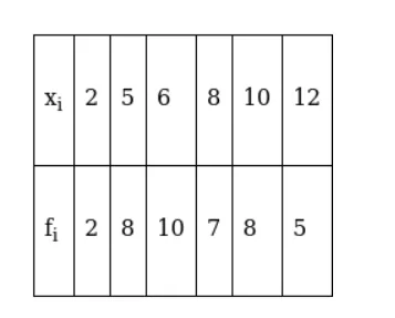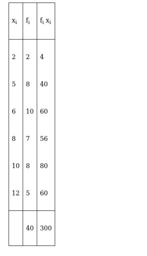 Therefore $\overline{\mathrm{X}}=\frac{\sum_{\mathrm{i}=1}^{6} \mathrm{f}_{\mathrm{i}} \mathrm{x}_{\mathrm{i}}}{\sum_{\mathrm{i}=1}^{6} \mathrm{f}_{\mathrm{i}}}=\frac{300}{40}=7.5$